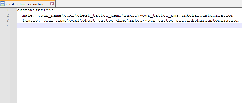 Save the file, rename it to something unique (if you haven't yet) and go ahead and test your new tattoo mod!